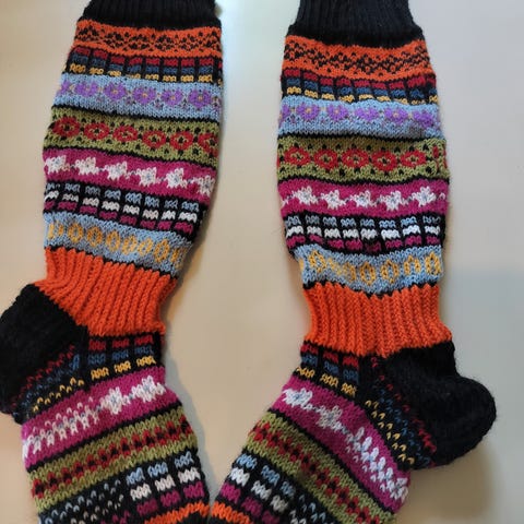Ruskeat pitkävartiset kirjoneule sukat. Koko 42-43. Hinta 23€ + postikulut.