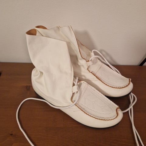 Poron koipinahoista valmistetut kengät. Koko nafti 36. Sisäpuoli lampaanvillaa, joka hieman kulunut varvasosasta. Muuten siistikuntoiset. Saa sovittaa.