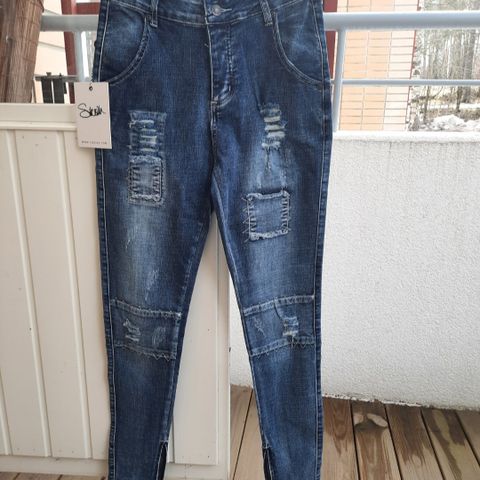 Siistit farkut, ovat olleet käytössä vain kerran. Vyötärö on tuunailtu joustavaksi.