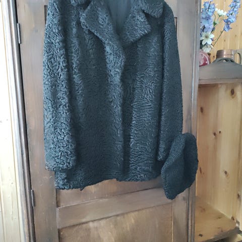 Keino mokkainen takki turkki vuorella.Koko M.Kirjonta kuvio edessä ja hihoissa.Napitus.Hinta 15€+ lähetys .