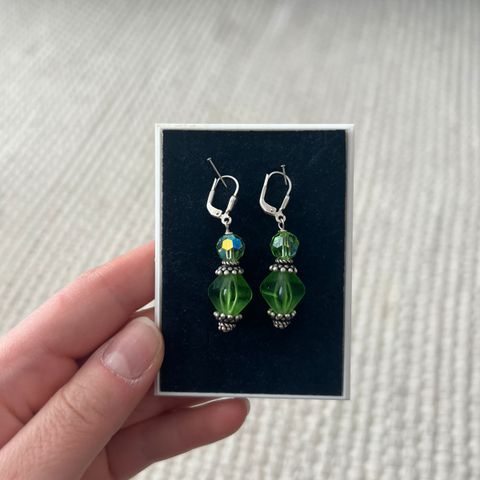 Uusi lasikristalli-korusetti, vaaleanvihreät tähdet, joissa takana ab eli helmiäismäinen pinta (kolmas kuva). Nikkelittömät. (Riipuksen mukana ei tule kaulaketjua.) Lasitähtien koko: 1,3 cm leveät/korkeat. Väri on hieman vaaleampi kuin kuvissa.