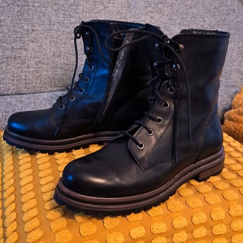 Valkoiset nahkakengät, sivussa vetoketju, edessä mustat nauhat, tekstiilivuori, koko 38, mahtuu ohuen sukan kanssa 38,5-39 jalkaan. Vain sovitettu, ei käytetty.