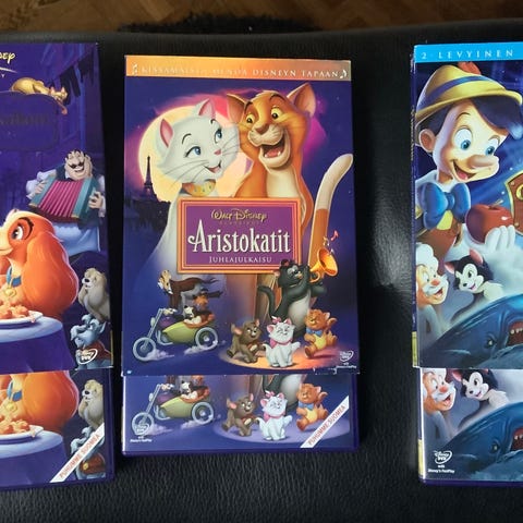 Löytyy melkein kaikki disney klassikot joista vain muutamasta ilmoitus joten kysy etsimiäsi. Nouto Lahdesta tai postitu 5e kirjeenä jolloin mukaan mahtuu toinenkin DVD myytävistäni jos haluaa seurantakoodin niin postitus 6e ärräpakettina. Kulkeutuu omien menojen mukaan Tampereelle ja Riihimäen asemalle tai Keravan asemalle. XXS paketteja en lähetä koska postilla on ollut tapana kadottaa ne.