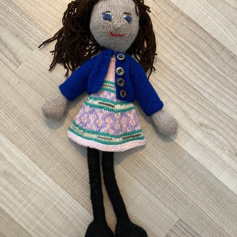 Nuken askarteluun tarvikkeita. Ihokangasta, täytettä ja lankaa hiuksiin. Lisäksi ohjeet.