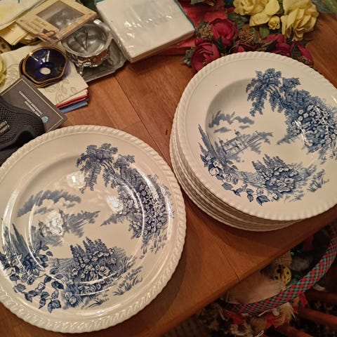 Aidot käsinmaalatut kupit ja lautaset samettisessa rasiassa.