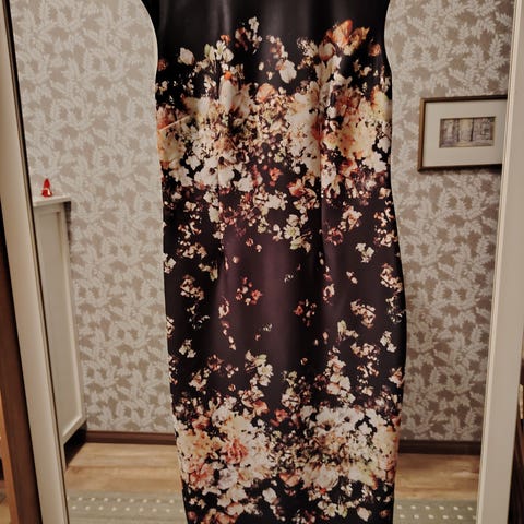 Musta-valko raidallinen mekko. Jämäkkää, pitsimäistä neulosta. Mekon pituus 94cm. Kai-kai mitta 43cm.