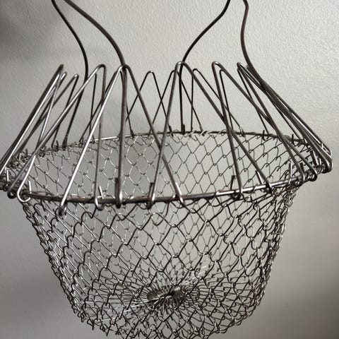Metallinen riippuva kukkakori. Kori on pyöreä ja valmistettu metallilangasta. Halkaisija on kuvassa näkyvän mittanauhan perusteella noin 40 cm. Kori ripustetaan ketjujen avulla esimerkiksi terassille, parvekkeelle tai puutarhaan. Sopii kukka- tai yrttiruukuille tai sammal- ja istutuskoriksi.