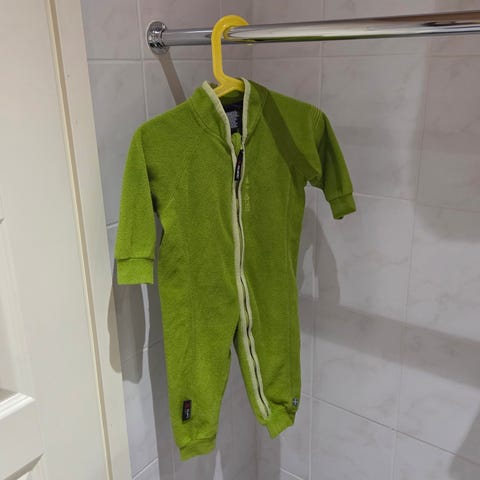 Turkoosin värinen, lämmin vuorinen trikoohaalari koko 70