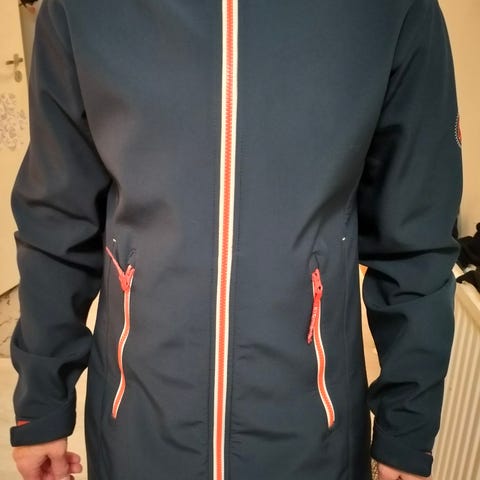 Sininen stormbergin parkatakki softshell materiaalia ja sisältä harjattu fleece. Lämmin ja vettä hylkivä materiaali. Helmassa kiristysmahdollisuus samoin hupussa. Upea takki 🙂 s koko menee myös koolle m koska joustava