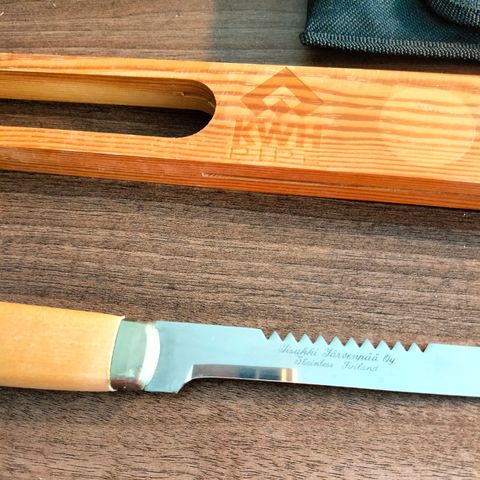 Laadukas japanilainen kalaveitsi mitallisessa puukotelossa.