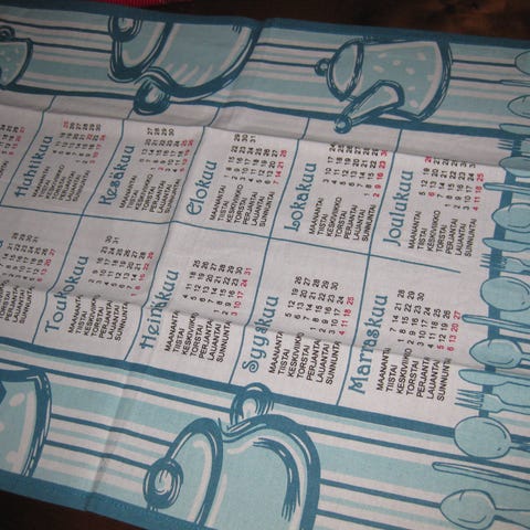Hyvässä kunnossa oleva kalenteripyyhe vuodelta 2010. Suomen eläimet-kuvioinen. Kok: 46x68cm. 100% puuvilla.Hinta 7e. Nouto