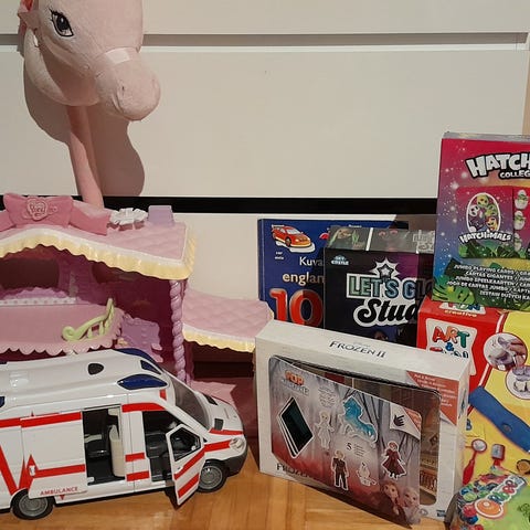 paljon erilaisia leluja, pelejä, kirjoja, nukkeja, autoja jne