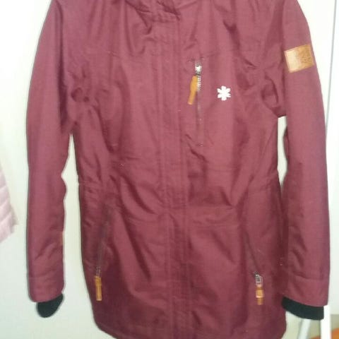 Ahkkan viinipunainen talvitakki irroitettavalla hupulla joka on nyörein kiristettävä. Vetoketjulliset Sivutaskut edessä ja povitaskut molemmilla puolilla takin vuoressa.