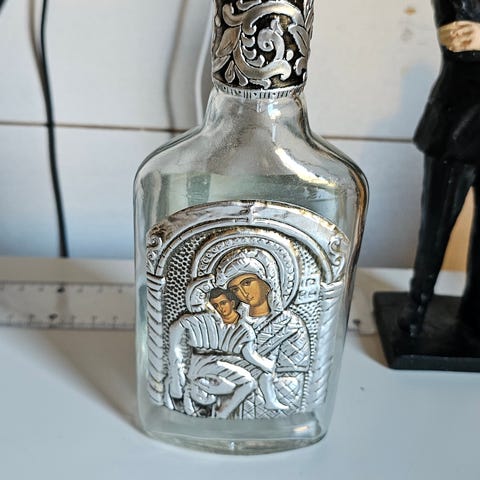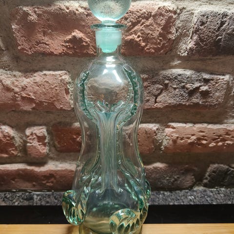 Kotimaisen kierrätyslasitaitelijan, Jukka Isotalon kierrätyslasista tehty vesipullo puukorkilla. Korkki juuri käsitelty leikkuulaudoille sopivalla öljyllä. Pinnassa on ”H2O” -hiekkapuhalluskoristelu.