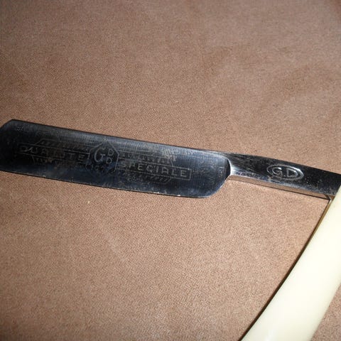 Hyväkuntoinen partaveitsi (teräs/metalli).