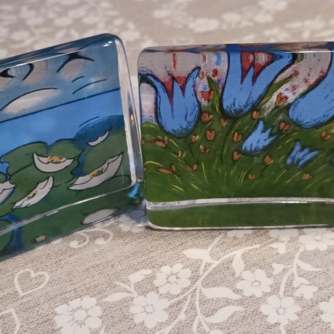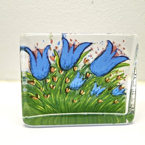 Heljä Liukko-Sundströmin Iittalalle suunnittelema lasikortti “Kissankellot”. Signeerattu “Heljä Liukko-Sundström”. Kortissa on myös Iittala-tarra.