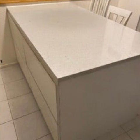 Kivitasossa ollut halkeamia, joita liimattu joskus vahvalla liimalla eikä huomaa päälle päin (valkoiset kohdat alhaaltapäin katsottuna). Taso on tukeva.