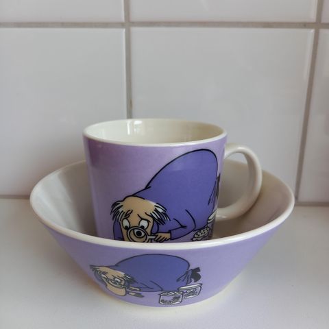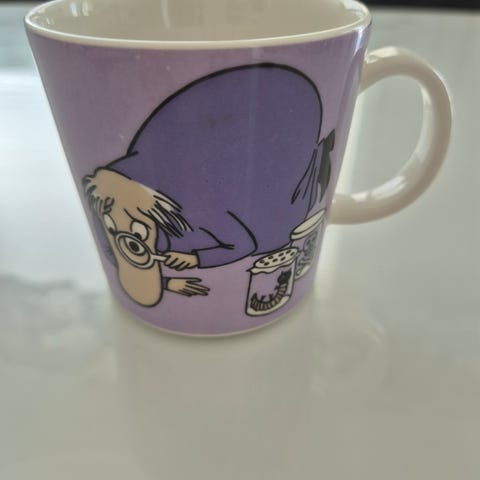 Violetissa mukissa kuvataan Hemuli yhdessä lempipuuhistaan, suurennuslasi kädessä tutkimassa hyönteisiä. Kuva on Tove Janssonin ensimmäisestä romaanista Muumipeikko ja pyrstötähti.