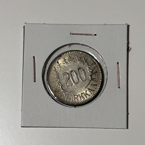 500 markkaa: männynoksia, kääntöpuolella vaakunaleijona kuten 100-markkasessa ja tyyliteltyjä kuusenhavuja, yleisväri sininen.