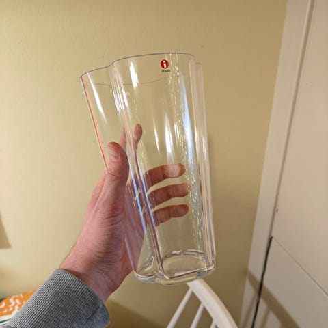 Myydään vain koristeena ollut ehjä kirkas iittalan aalto maljakko 120mm. Alkuperäinen pakkaus.