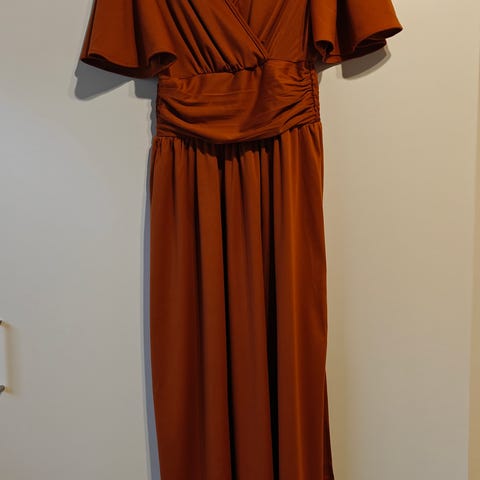 Laadukas, uudenveroinen juhlamekko koko S. Vyötärön ympärys noin 70 cm. Pituus olkapäältä 92 cm, ympärysmitta kainalon alta noin 84 cm, hieman joustava kangas. Elastaania 5%. Trikoovuori, sivulla vetoketju. Edessä oleva ruusuke irrotettavissa.