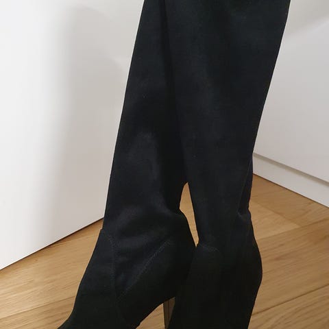 Pitkävartiset, matalakorkoiset, mustat saappaat. Koko 6,5. Varren korkeus maasta 46cm.