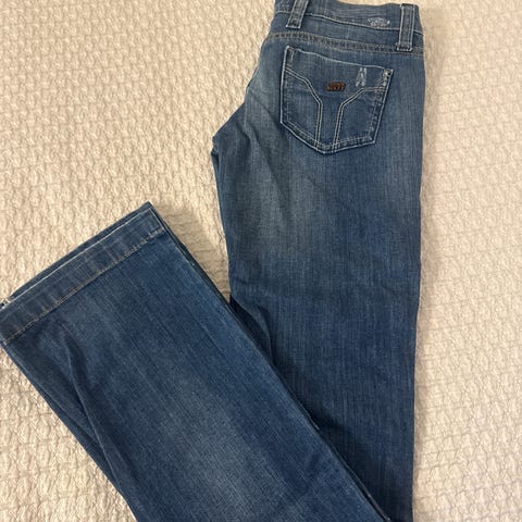 Tummahko sininen, hiukan kulutettu väri paikoin. Huom. Taskuista jäänyt hiukan painaumajälkeä, katso kuvat.