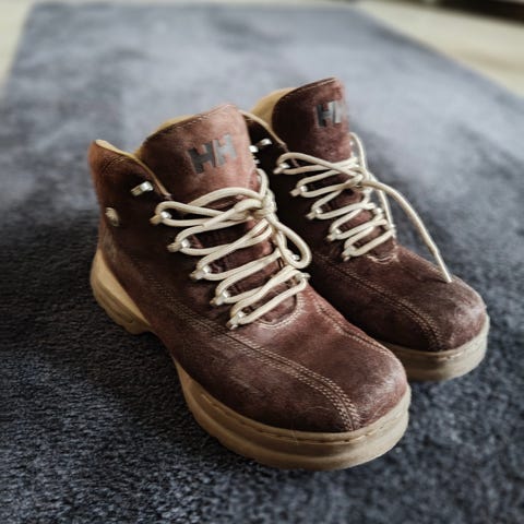 Takana pieni repeämä nahkassa vasemmassa kengässä, näkyy kuvassa.