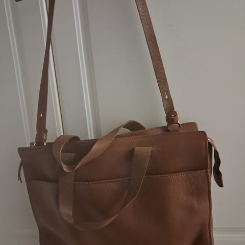Nahkasalkku, johon mahtuu läppäri. Koko 40x30 cm, olkahihna