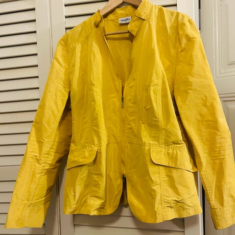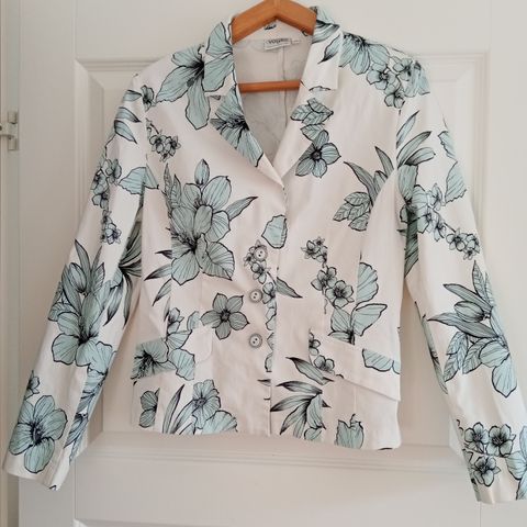 Voglian juhlava bleiseri hopeanhohtoisesta kankaasta. Kokomerkintä 46, mutta vastaa enemmän kokoa 44.