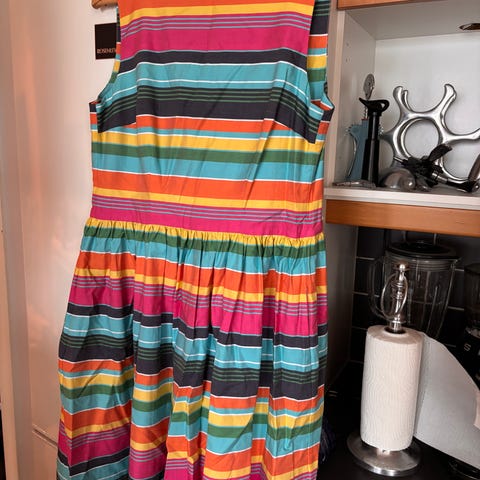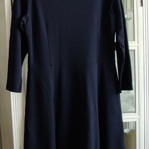 Erittäin hyväkuntoinen, lähes uudenveroinen, en löydä huomautettavaa. Pesty villapesuaineella, nurjalla pientä jälkeä silityksestä. Säilytetty siististi henkarissa pesun jälkeen kylmävarastossa, ei hajuja, ei tahroja ja täysin ehjä. Ohutta neulosta joka päällispuolelta sileä ja nurjalta karhean villamaista, on ohuudestaan huolimatta lämmin. Väri on tummansininen, ei musta. Mekkoon kuuluu yö joka pysyy sivusaumoissa olevissa vyölenkeissä.
