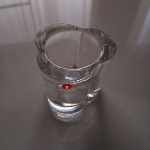 Tuikkulasi 2 kpl – kirkas lasi. On ostettu hyvin kauan sitten joko Nuutajärveln lasitehtaalta tai iittalasta. En tiedä mallia, muoto vähän epäkesko, joten voi olla koekappale tai kakkoslaatu.
