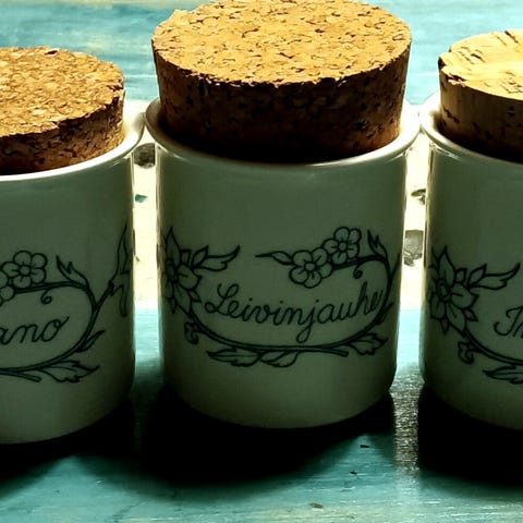 6 kpl pieniä maustepurkkeja (kanelia, neilikkaa, kardemummaa, inkivääriä, pippuria ja mantelia).