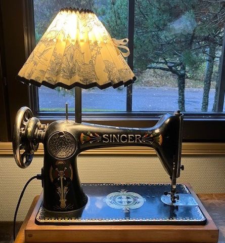 Tämä Singer-Man syntyi 1910. Ainakin päänsä eli valaisimen kuvun osalta, mikä on harvinaisen hyvin säilynyt Singer-oil -ompelukoneen-öljy-purkki 1910-luvulta. Valaisimen jalkana toimii Vanhan Singer ompelukoneen kaunis kukkakuvioinen osa ja itse Singer-Mannin jalat ovat tietenkin paininjalkoja. Lankarulla ja saksetkin löysivät paikkansa valaisimessa. Enempää historiaa ja hymyä ei voisi toivoa tältä ompelupisteen valaisimelta.