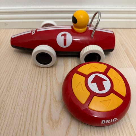 Kuvien käytetty ja toimiva kilpa-auto. Auton pohjasta on hävinnyt patterien suojakansi. Patterit kyllä pysyvät ilmastointiteipin palalla hyvin paikoillaan.