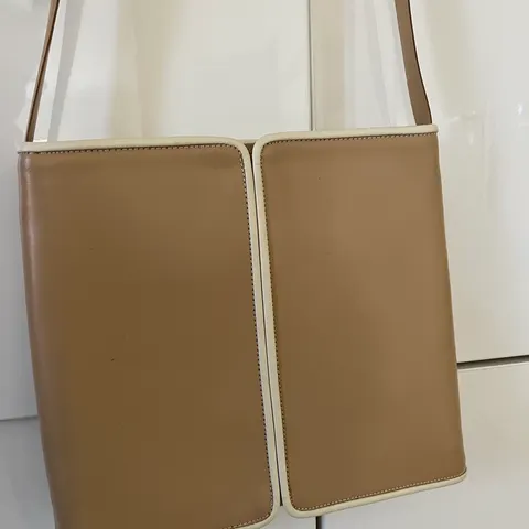 Musta Vezzano merkkinen laukku. Laukun sisällä on keskellä vetoketjulokero eli sisällä on kaikkiaan kolme lokeroa.