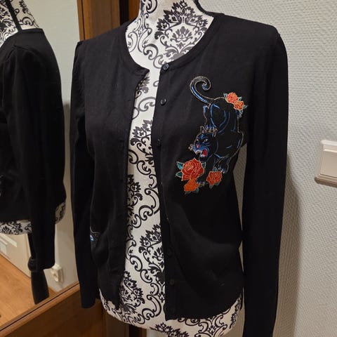 Myydään naisten musta neuletakki, jossa on muutamia mustia paljetteja. Myös vyö. Koko S, vastaa hyvin kokoaan. Vero Moda.