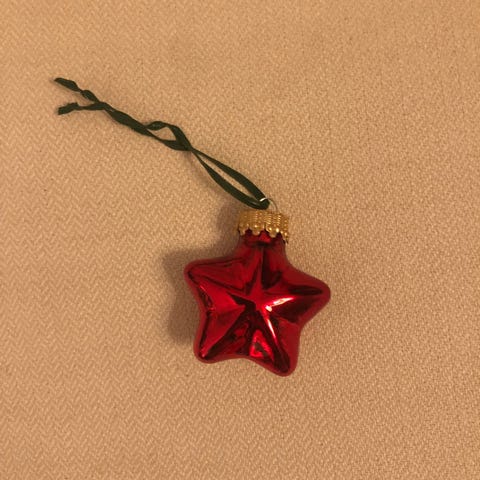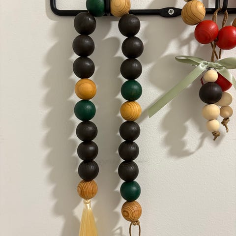 Paketti jossa kolme puuhelmikoristetta, pellavalangalla yhdessä ja pohjalla pieni metallinen tiuku. Vanhan ajan muoviton joulukuusen koriste tai koriste mihin vain juhlatilaan 8e/kaksi pakettia