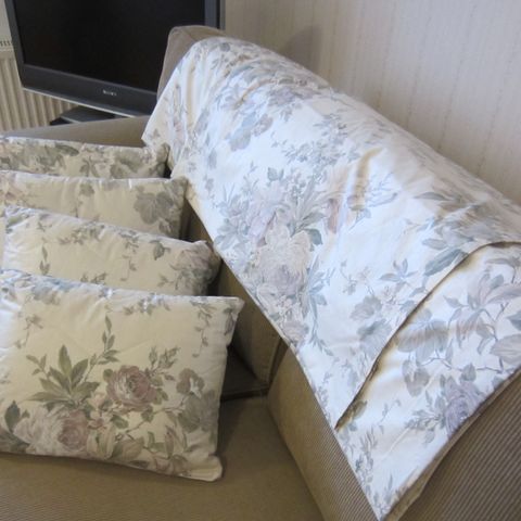 Verhoiksi tehty mutta sopii myös pöytäliinaksi tai sisustustyynyiksi.