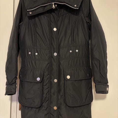 Röhnisch-merkkinen talvitakki/toppatakki koossa 36. Takki on todella pehmeä ja lämmin. Siinä on vähän kulumaa ja likaa, jotka eivät ole vaikuttaneet käyttöön. En ole yrittänyt poistaa tahroja. Takissa on huppu, jota voi kiristää nauhoilla. Etupuolella on kaksi taskua, joissa kummassakin on sulkemista varten kaksi nepparia.