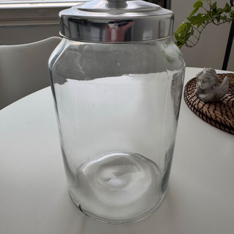 Kannellinen käyttämätön lasipurkki Finnmari. Korkeus 15 cm, halkaisija 11,5 cm.