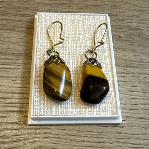 Korvakorut tiikerinsilmää. Koruosan pituus n. 3.6 cm. Käyttämättömät. 5 e.