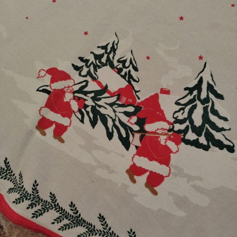 Painettu kuvio molemmin puolin reunoissa. Yksi näkyvämpi kudontavirhe, kuva. Muutama valkoisempi samankaltainen virhe. Nouto tai lähetys.