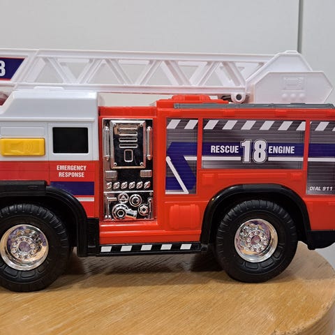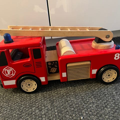 Myydään pieni puinen vedettävä paloauto, joka kulkee eteenpäin.