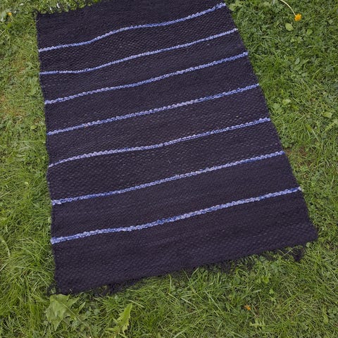 Kangaspuilla kudottu matto vanhoista sinisistä farkuista ja sinapinkeltaisesta trikoosta, koko 120x165 cm.