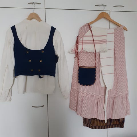 Upea vintage, ehjä ja siisti kokonaisuus. Valmistaja Helmi Vuorelma. Koko n 38. Vyötärön ympärys 76 cm, olka-helma pituus 123 cm, sinisen mekon pituus 82 cm. Mekko, paita, esiliina, aidot korut. Lisäksi pitkät valkoiset vintage puuvillasukat. Myydään vain kokonaisuutena! Mieluiten nouto, voidaan järjestää sovitukseen Helsinkiin tai Inkooseen kun todellisia ostoaikeita.