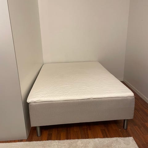 Erittäin siisti kuin uusi. Ollut yhden hengen taloudessa. Ei haise eikä tahroja. Sängynpääty valkoinen, tummanharmaa kangas. Sänkyjä ja petauspatjaa vaihdettu eripäin, ei painaumia. Patja on puolikova. Jos haluat päädyn erikseen hinta 70 euroa ja sänky 150 euroa.