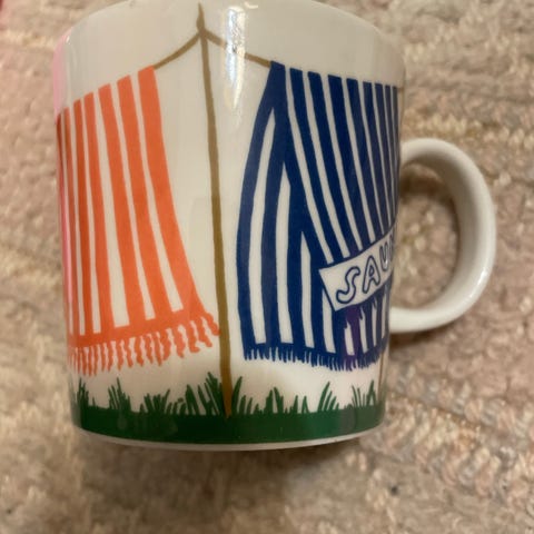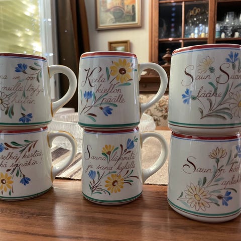 Kaksi koristekäytössä ollutta Arabian saunamukia. Yksi muki maksaa 70 euroa, yhteensä 140 euroa. Myydään myös yksittäin.