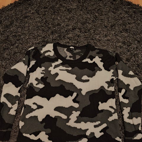 Harmaa villatakki sinimustavalkoisin kuvioin. Kuin uusi.
