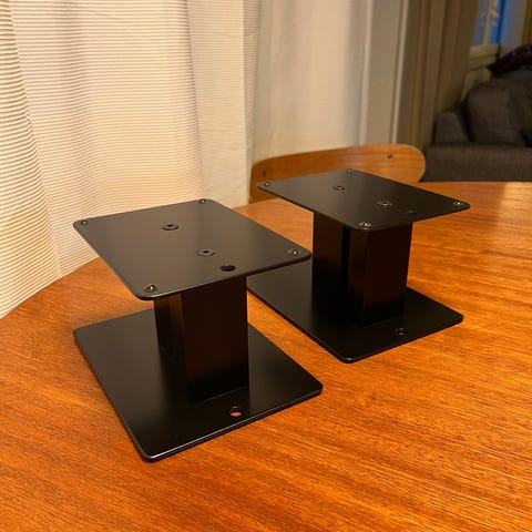 Kaiutinjalustapari. 16,5cm x 18 cm jalustan yläosan mitat. 61 cm korkea. Pohjalevyssä kierteet lisäjaloille.